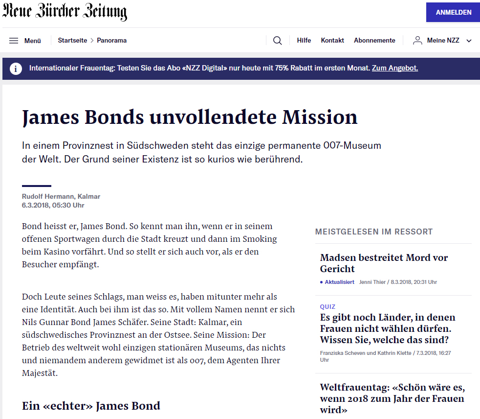007-Museum der Welt. Der Grund seiner Existenz ist so kurios wie berührend. Bond heisst er, James Bond. So kennt man ihn, wenn er in seinem offenen Sportwagen durch die Stadt kreuzt und dann im Smoking beim Kasino vorfährt. Und so stellt er sich auch vor, als er den Besucher empfängt. Doch Leute seines Schlags, man weiss es, haben mitunter mehr als eine Identität. Auch bei ihm ist das so. Mit vollem Namen nennt er sich Nils Gunnar Bond James Schäfer. Seine Stadt: Kalmar, ein südschwedisches Provinznest an der Ostsee. Seine Mission: Der Betrieb des weltweit wohl einzigen stationären Museums, das nichts und niemandem anderem gewidmet ist als 007, dem Agenten Ihrer Majestät. http://bond.trendolizer.com/2018/03/james-bonds-unvollendete-mission-nzz.htmlhttp://20min.ch.ma/aktuell/james-bonds-unvollendete-mission http://www.schweiz-news.com/Artikel/james-bonds-unvollendete-mission |