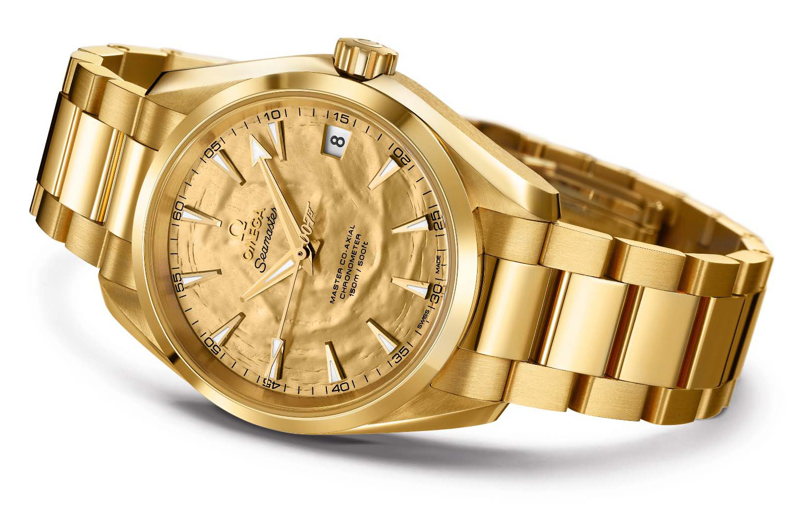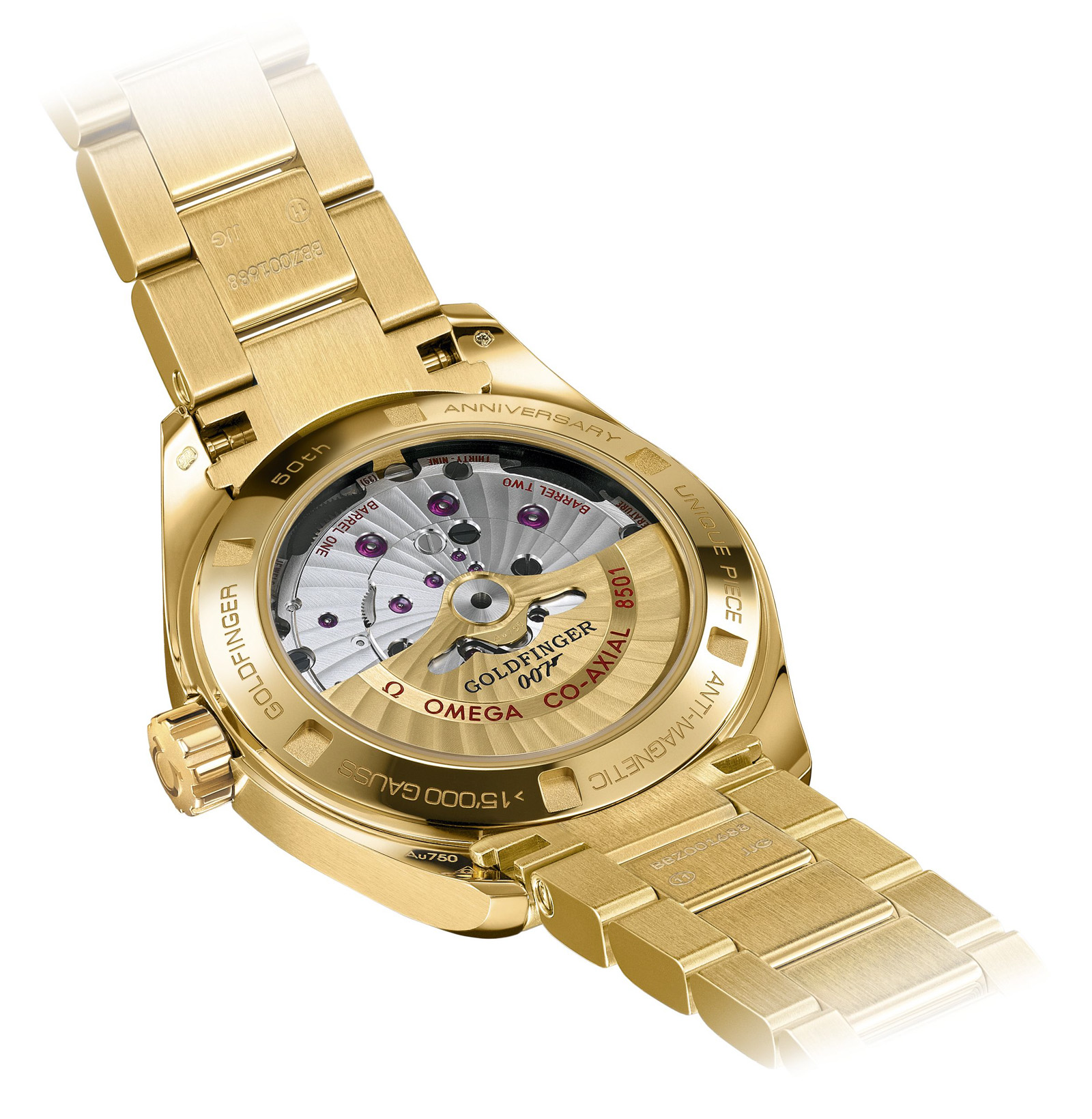 What's inside this very special timepiece is as important as its design: it is powered by the OMEGA Master Co-Axial calibre 8501 revealed through its transparent crystal caseback. The one that equips this unique Seamaster Aqua Terra features an 18K yellow gold rotor and bridge, distinguishing it from the 18K red gold normally associated with the movement. The oscillating weight is also made of 18K yellow gold. The mechanical movement delivers extraordinary timekeeping performance and reliability and it is also resistant to magnetic fields greater than 15,000 gauss, solving a challenge that has perplexed watchmakers for centuries.