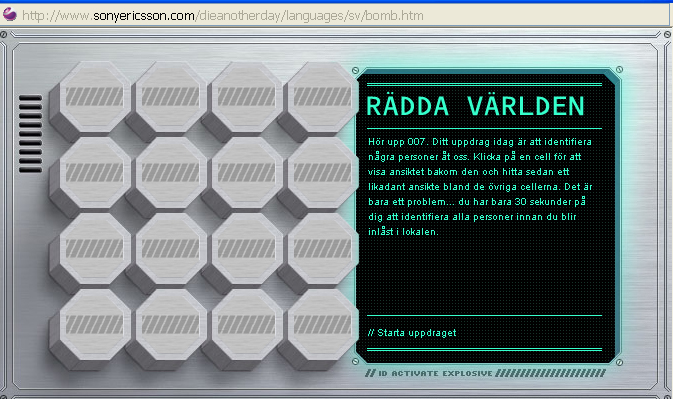 | Die Another Day Välkommen till webbplatsen för Sony Ericsson och James Bond – Die Another Day. Var försiktig... du kommer nu att få tillgång till hemlig information om Sony Ericsson och Die Another Day. Se till att bekanta dig med utrustningens tekniska specifikationer och vilken roll den spelar – särskilt kommunikationsenheterna T68i och P800. Om ditt uppdrag ska lyckas måste du skaffa information om filmen och få tag på så många prylar som möjligt som kan förbättra din standardutrustning. Det slutliga testet blir att klara av vårt interaktiva spel som sätter din minnesförmåga och mentala styrka på hårda prov. Nu hänger allt på dig. |