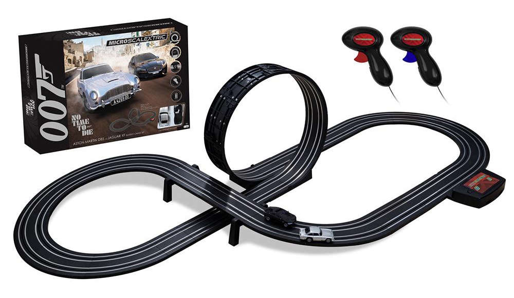 kids will always be having fun with this set as the cars The latest James Bond film, No Time to Die, is the 25th instalment of the franchise, and like previous James Bond films, No Time to Die features both classic and modern vehicles driven by the villain as well as 007 himself. This set features an Aston Martin DB5 taking on the Jaguar XF, and includes 4.08metres of track, with 9 track layouts which includes a loop-the-loop and half pipe. With speed limiting hand controllers you can be sure the kids will always be having fun with this set as the cars will be less likely to fly off the track. This set is battery operated. Turn this into a mains powered set with the new Micro Scalextric Mains Powered Track Piece (UK) here. Aston Martin, the Aston Martin Wings Logo and the model names "Vantage", "DBS", "DB5" and "DB10" are trademarks owned licensed or used by Aston Martin Lagonda Limited. All rights reserved. Jaguar and the leaper device are trademarks owned and licensed by Jaguar Land Rover Limited. James Bond materials © 1962-2020 Danjaq and MGM. Related James Bond Trademarks are Trademarks of Danjaq, LLC. All Rights Reserved.