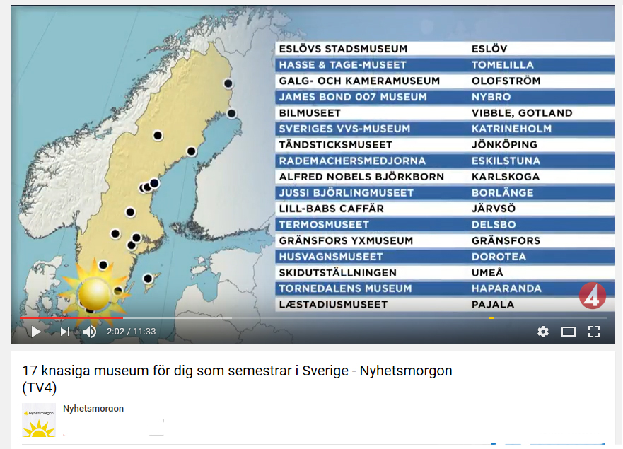 17 knasiga museum för dig som semestrar i Sverige - Nyhetsmorgon (TV4). James Bond 007 Museet i Nybro döp om sig till James Bond och han heter Schäfer. http://www.007museum.com/ 17 knasiga museum för dig som semestrar i Sverige - Nyhetsmorgon (TV4) 21 juli 2017