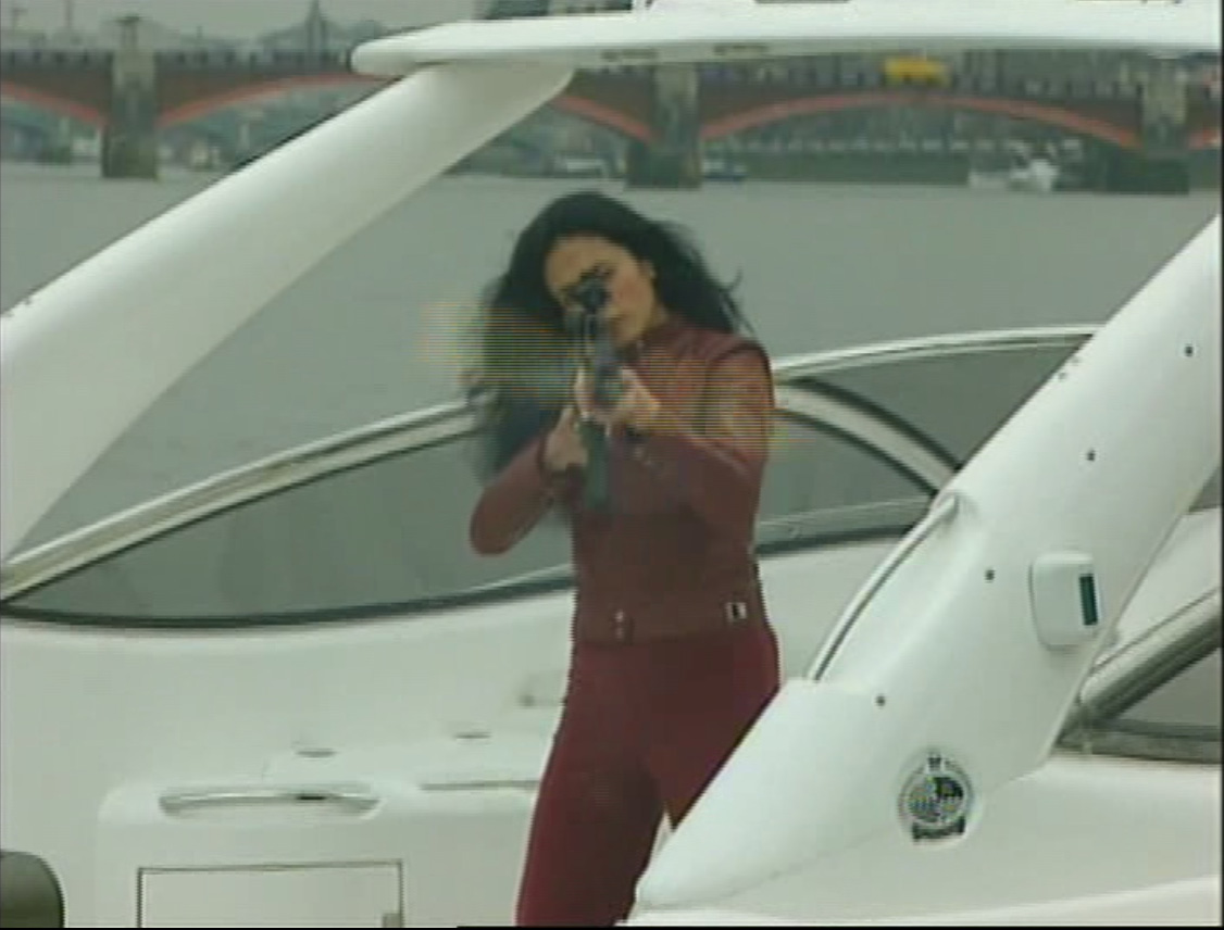 keeping one step ahead of the authorities. Bond spots Cigar Girl in a powerboat on the Thames and steals Q's retirement project: a boat loaded with armaments for "fishing". After a spectacular chase, Bond catches up with the girl who is trying to escape in a hot air balloon. Bond is hanging on by a rope as Cigar Girl opts to blow herself up rather than face the consequences, leaving 007 dropping onto the Millennium Dome.